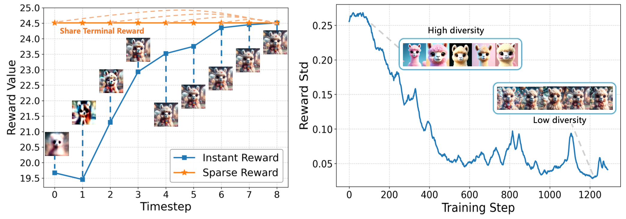 Motivation. (Left) Sparse vs. Instant Reward Signals During Generation. The sparse terminal reward remains constant, failing to provide varying values for intermediate steps. (Right) Diminishing Reward Std as Policy Converges. Due to the reliance on reward diversity, the reward std declines as the training process advances, potentially leading to optimization stagnation.