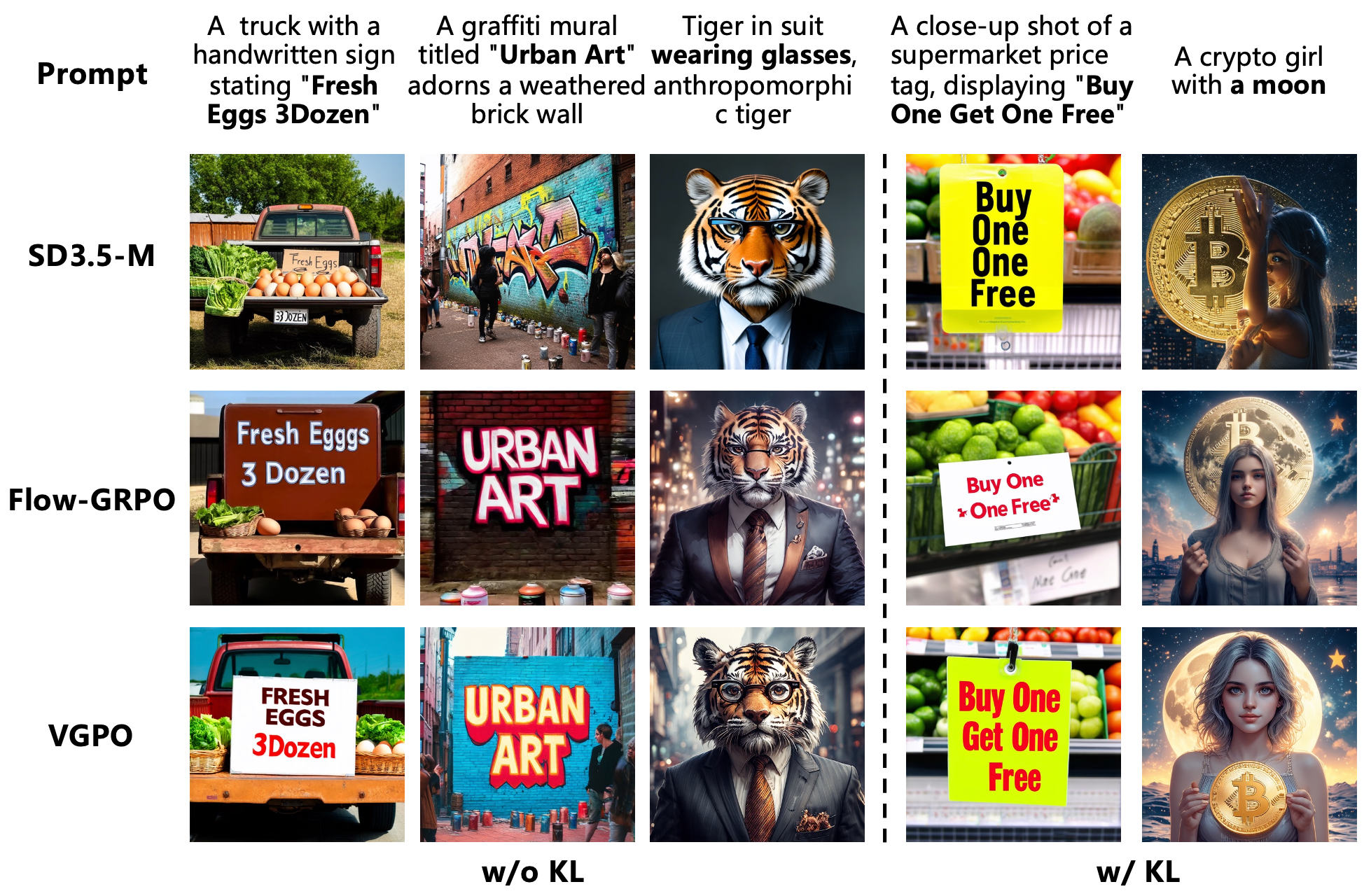 Qualitative Comparison. VGPO achieves superior performance in task accuracy, image quality and fine-grained details.